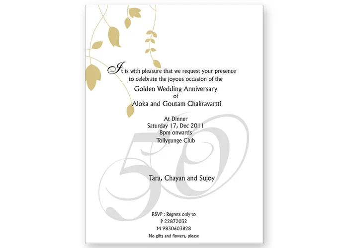 Designed for a traditional couple, this card is simple and classy in its design. The leaves were printed in gold, which the 50 was a subtle silver.