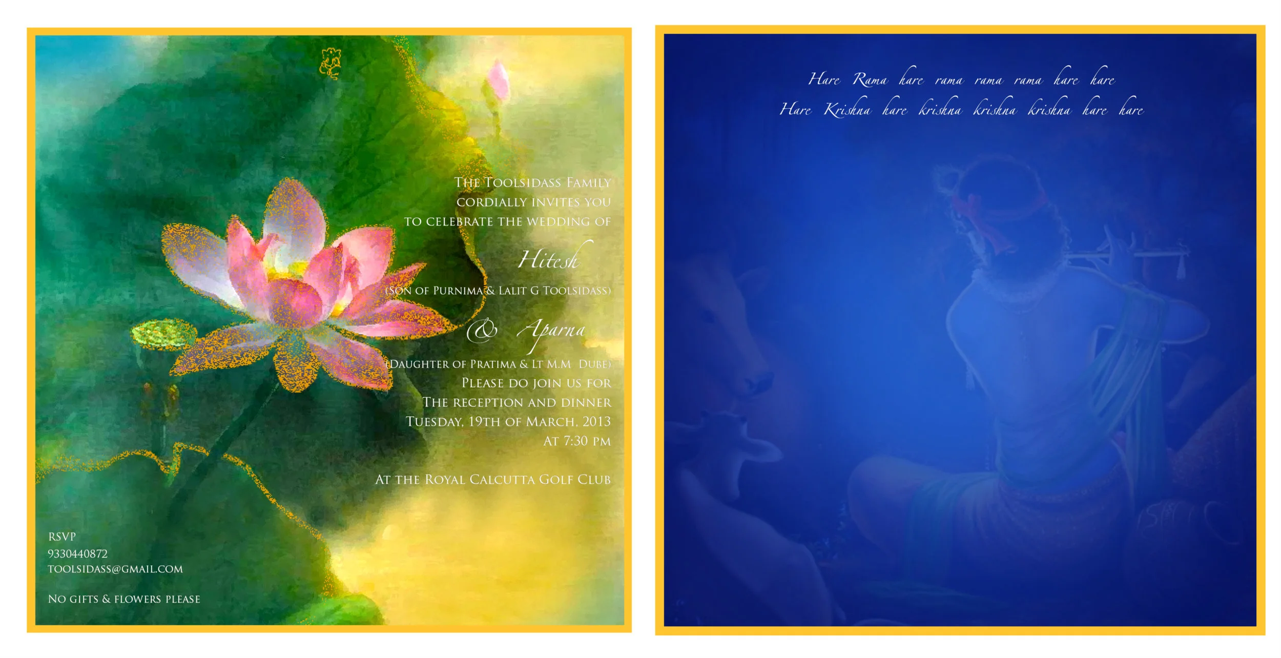 Created for a traditional couple, this card uses the Alpana pattern rendered in gold and bright colors to bring richness to this auspicious occasion.